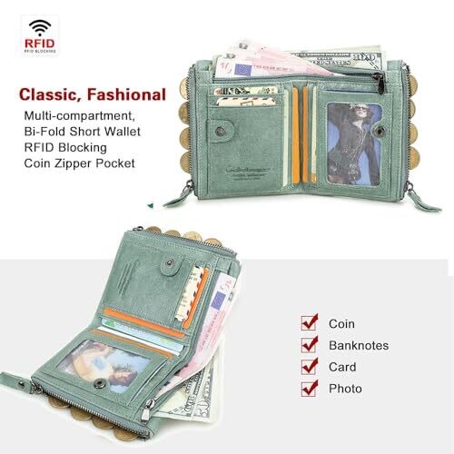 Contacts Soft Leather Wallet – Small Bifold Coin Purse, Matcha Green, RFID Blocking
