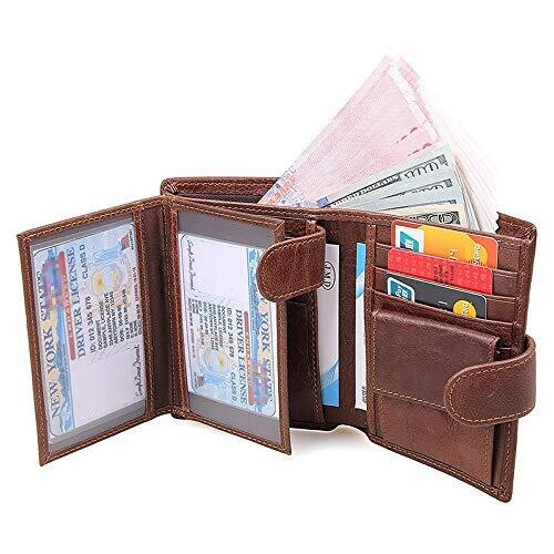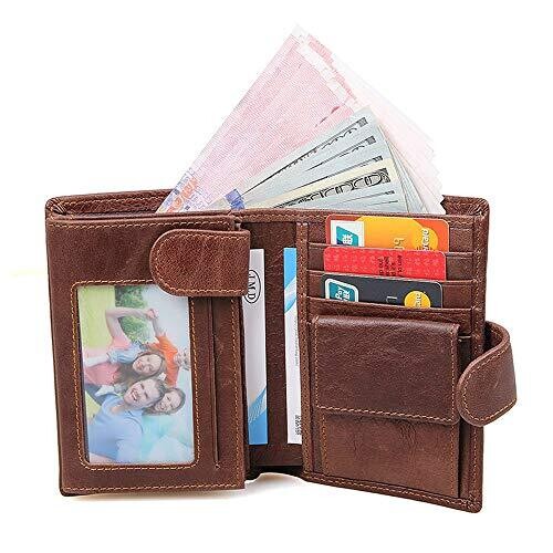 • Genuine Leather Trifold Wallet RFID Blocking Zip Anti-Scan Coffee