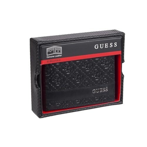 A bold Guess wallet featuring a repeating logo design with a contrasting red stripe. This slim, genuine leather bifold keeps cards, ID, and cash organized without bulk, offering soft touch and durable everyday use.