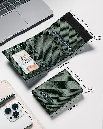 A compact, RFID-blocking trifold wallet in green with three ID windows, a zipper pocket, and multiple card slots. Ultra-slim design fits front pockets while keeping essential cards and cash organized for everyday use.