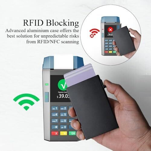 This metal wallet includes RFID blocking to prevent unauthorized reading of card information. Minimalist design