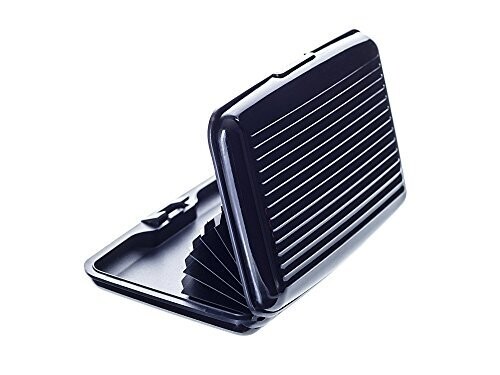 Designed with rounded edges a metallic surface and a ribbed side. Card layout displays cards when opened for easy access and quick rehanding of important cards. Six compartments accommodate up to 12 cards, which can be removed easily and may also be used as a money case or business card holder. The metal housing provides durability and protects contents from weather and wear. RFID and NFC shielding blocks wireless signals to prevent data theft from cards.