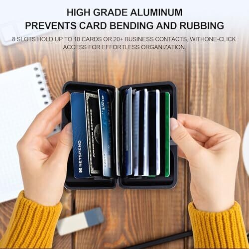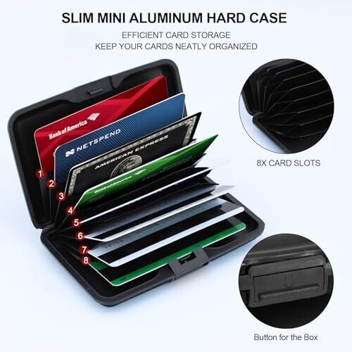 YOKONICO's aluminum card holder provides RFID blocking in a slim, lightweight design. With 8 card slots, a built-in money clip, and a compact form, it protects essentials while reducing bulk for everyday carry or travel for men and women.