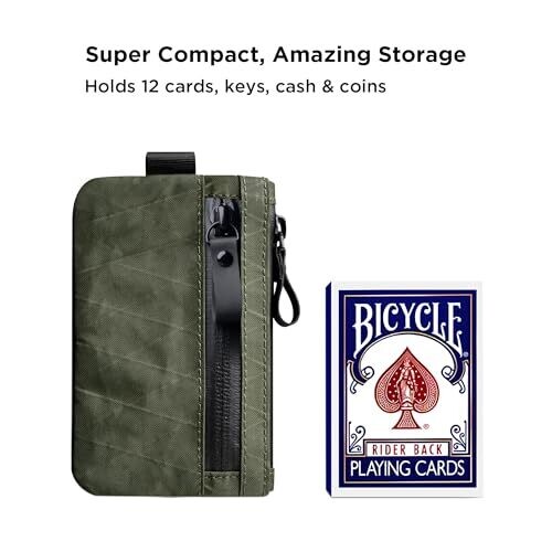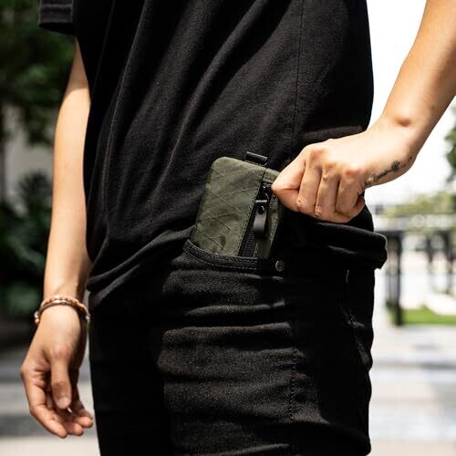 Compact, weatherproof ALPAKA Zip Pouch X-Pac keeps cards, cash, and coins organized with a slim, minimalist profile. RFID-blocking main compartment, internal divider, and splash-resistant Zips make it ideal for front-pocket use, EDC, or travel, in Dark Green VX21.