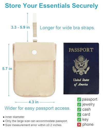 Bamneat’s nude passport-size bra wallet offers a discreet hidden pocket with an adjustable elastic strap. Protects valuables like passports and cards with RFID blocking, while remaining comfortable, versatile, and easy to wear under clothing or as a neck pouch.