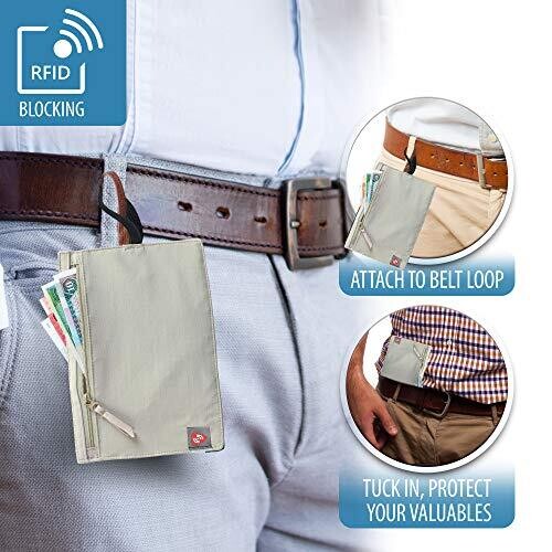Slim, ultra-slim travel belt wallet that tucks discreetly into your belt area. RFID-blocking lining protects cards and passport, with three inner compartments and a zip pocket for cash, coins, IDs, and cards. Lightweight, moisture-resistant nylon for comfort and security.
