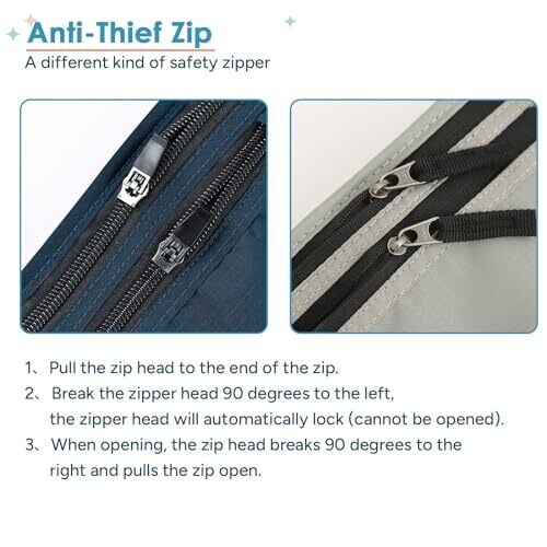 Anti-theft zipper uses a unique locked closure system where the zipper head must be pulled upwards at a specific angle to open.