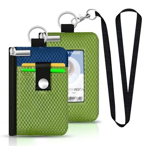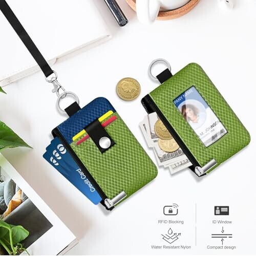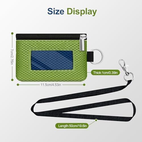 Dual-layer RFID protection with front and back pockets for cards and IDs. The back pocket holds up to 8 cards and includes a clear ID window. Construction uses durable 410D nylon with a water-resistant coating, sturdy zippers, and a soft polyester lining. Overall dimensions are 4.75 inches by 3.12 inches by 0.5 inches, with a weight of 60 grams. Includes an 18.25 inch lanyard for hands-free use. Unisex design suitable for both men and women.