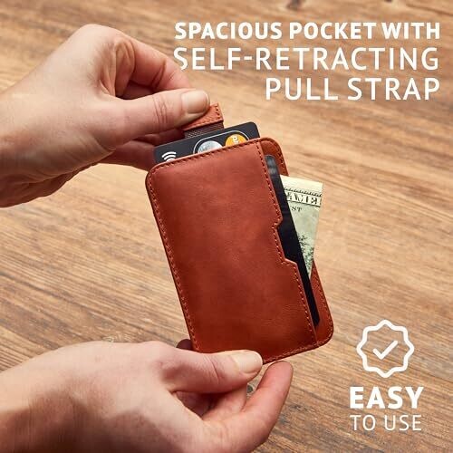 A minimalist front-pocket card holder crafted from premium Italian leather in Cognac. RFID protection guards cards, while an ultra-slim design fits up to eight cards across three pockets. Includes a smart retractable strap for quick access and elegant gift-box packaging.