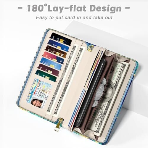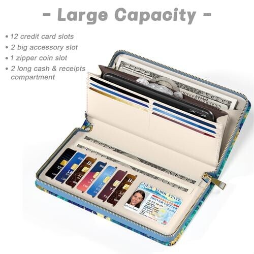 • Artful design meets everyday practicality with a large capacity that fits cards, cash, and travel necessities, plus a wrist strap for effortless carry during shopping or travel.