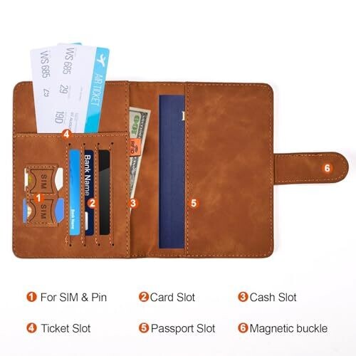 Suitable for both women and men; features multiple slots for passport, air ticket, business cards, credit cards, and SIM cards.