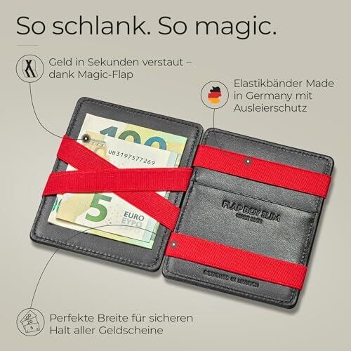 JAIMIE JACOBS Magic Wallet Flap Boy Slim is the original slim wallet with RFID protection, crafted from genuine Italian calf leather. Its innovative magic flap keeps cards and cash secure, while its compact design fits front or back pockets, handmade in Europe in black with red.