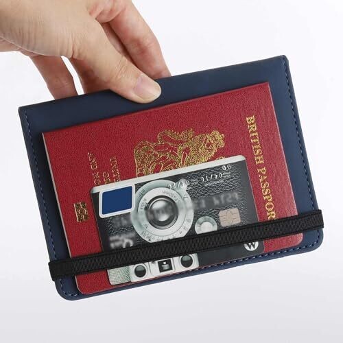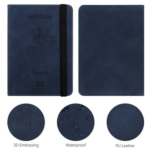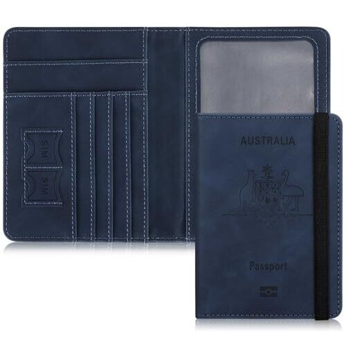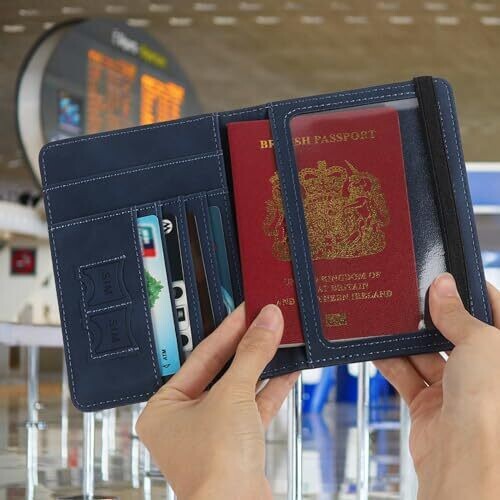 Premium PU leather passport holder organizes cards, passes, cash, and documents in one compact, lightweight case. RFID blocking protects personal data while traveling, with eight card slots and a sleek blue finish for both men and women.