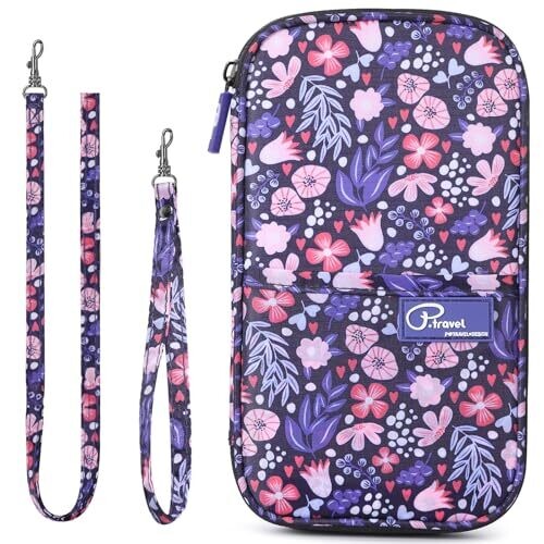 A stylish, family-friendly travel wallet with RFID blocking lining to protect cards and personal information. It features zippered pockets, multiple compartments for passports, boarding passes, tickets, phones, and cash. Rainproof, compact, with detachable neck and wrist straps for easy access.