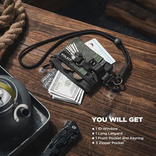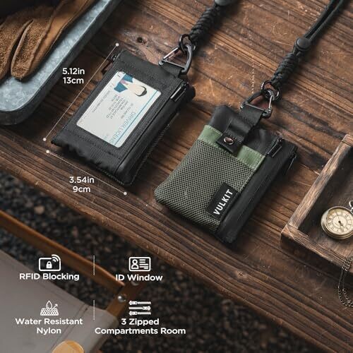 VULKIT's compact RFID wallet for women and men combines a slim zipper design with durable, water-resistant nylon. It features an ID window, 3-zip layout, RFID protection, holds 10–15 cards plus cash, and includes a key fob and travel lanyard options.