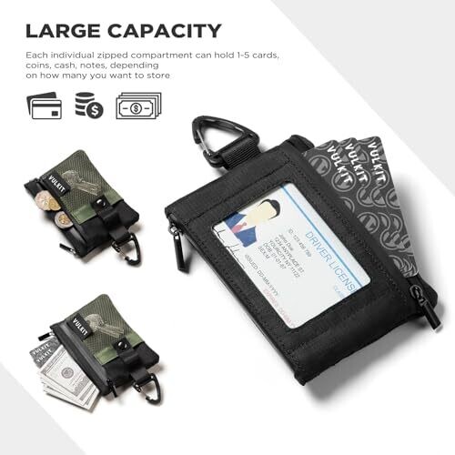 Structure includes three zipped compartments and one ID window; each compartment is spaced to securely store cards, cash, coins, and other essentials for easy organization.