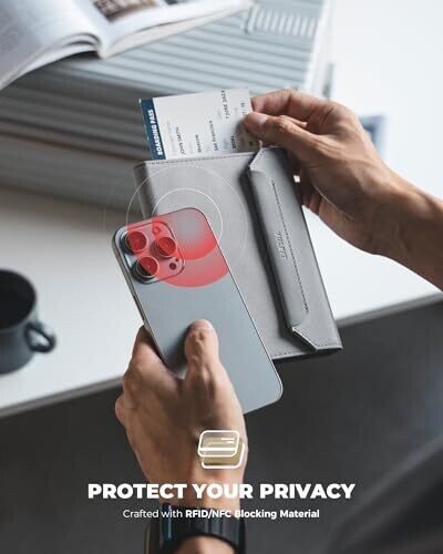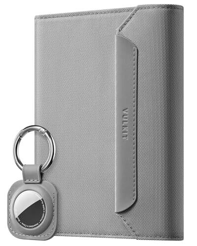 Vulkit's slim, unisex passport wallet blends modern style with practical organization. Crafted from vegan grey faux leather, it securely holds cards and passports, with a detachable AirTag holder, quick-access passport band, and a magnetic closure for travel on the go.