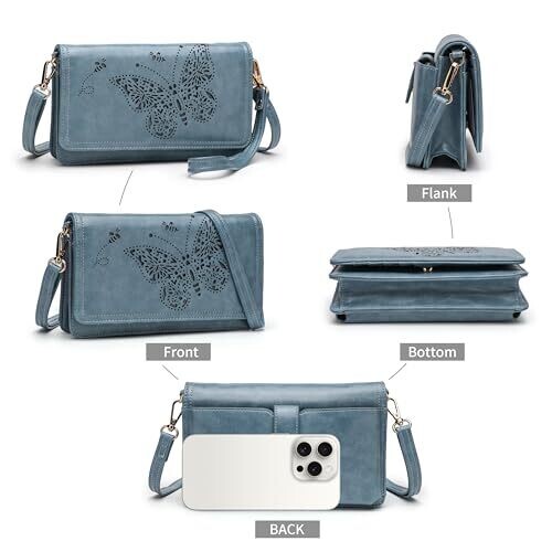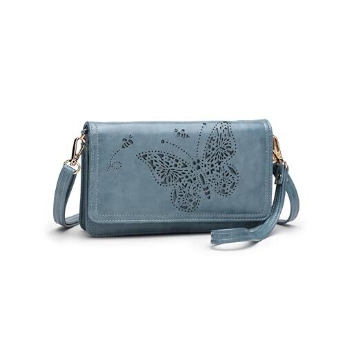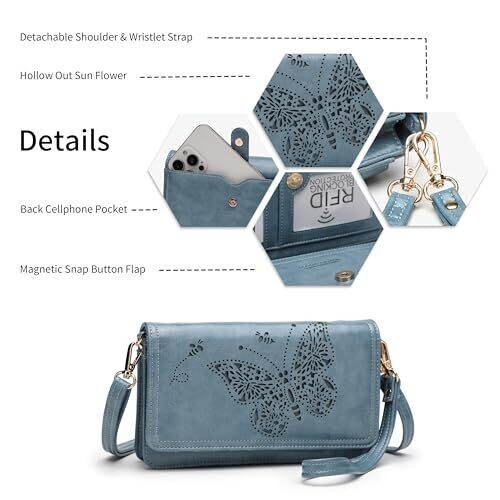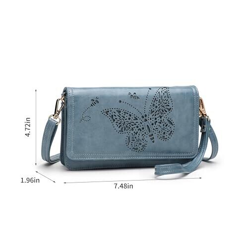 The product is a multi-function crossbody bag designed for women, offered in blue and described as small in size. It is constructed from premium vegan leather with a glossy surface and a gold zipper, featuring a butterfly pattern. The bag functions as a crossbody bag, a shoulder bag, or a wristlet wallet. Storage includes 1 main pocket and 1 interior zipper coin pocket, plus 7 card slots, 1 ID window, 1 front pocket, and 1 cellphone pocket. It supports RFID blocking functionality. Dimensions are 7.48 inches in length, 4.72 inches in height, and 1.96 inches in depth, with an extended shoulder strap for taller users. Fits most large smartphones up to 6.7 inches.