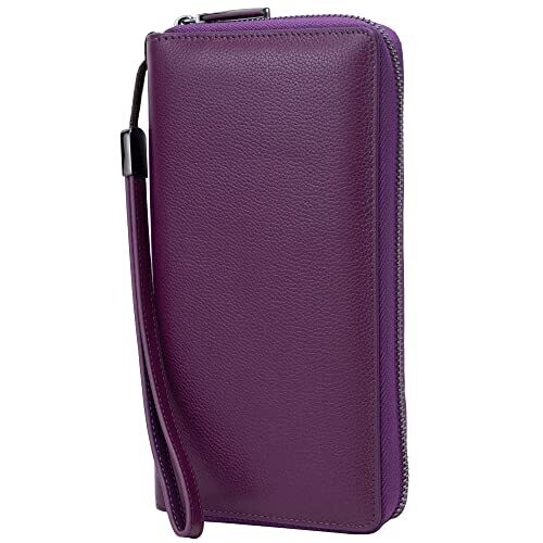 Stylish purple leather wallet that blocks RFID signals while keeping essentials organized. It offers 17 card slots, multiple compartments for cash, coins, passport, and more, with a secure zip-around closure. A versatile travel purse and wristlet with gift-ready packaging.