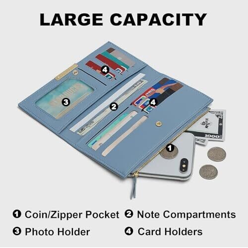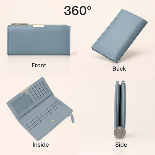 Experience everyday luxury with a slim, customized blue leather RFID wallet for women. This travel-ready purse keeps essentials organized with 11 card slots, ID window, cash pockets, and a coin zipper, while blocking 13.56 MHz RFID scans for peace of mind.