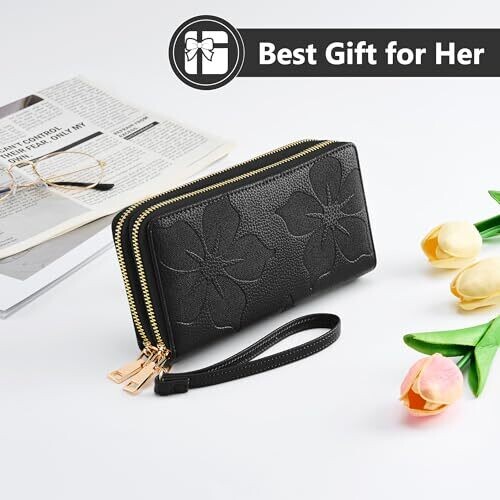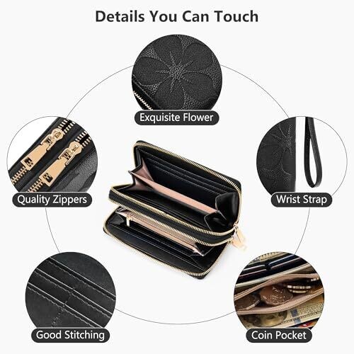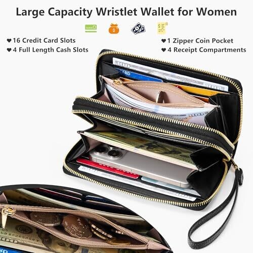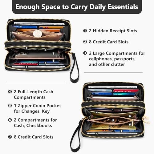 Espera Women Wallet RFID Blocking Large Capacity Card Holder Purse Double Zip Leather Designer Ladies Clutch with Wristlet, Black, 7.87 x 3.94 x 1.57