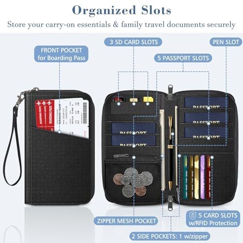 Multiple compartments include 5 passport pockets, 5 card slots, 2 side pockets (one with zipper), 1 zipper mesh pocket, 1 pen holder, and 3 SD card slots. The outside front pocket provides quick access to documents at the airport. RFID blocking linings protect cards from unauthorized scans. Material is premium vegan leather with strong zippers and an anti-tearing wristlet. The product is designed to be roomy yet lightweight, capable of storing carry-on essentials and all travel documents in one place. It is intended for safe family travel across airports, marketplaces, airplanes, buses, trains, and events.