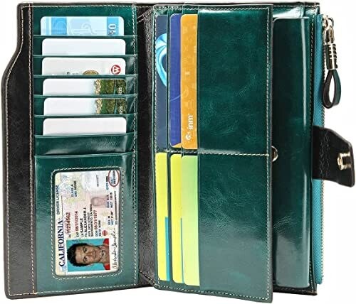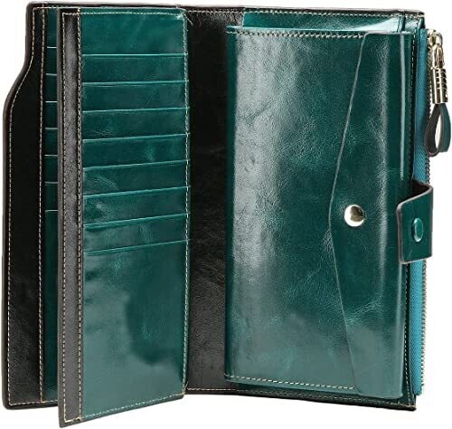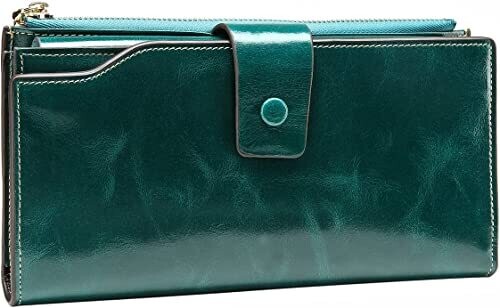 Premium wax leather clutch wallet that blocks RFID signals to protect cards and IDs. It offers large capacity, smart organizing for cards, cash, coins, and phone, in a sleek green purse—an ideal daily companion and thoughtful gift.