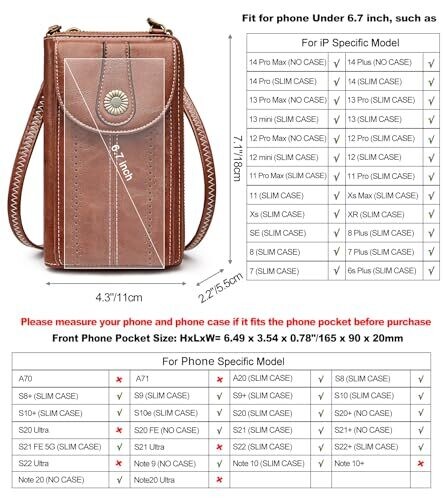 Product is a vegan leather crossbody purse with RFID blocking capabilities. Materials include reinforced stitching and bronze-tone metal hardware. The front pocket accommodates devices up to 6.7 inches. The overall design combines a front phone pocket with a main wallet compartment. Wallet features include multiple card slots (8 total: