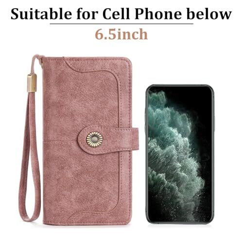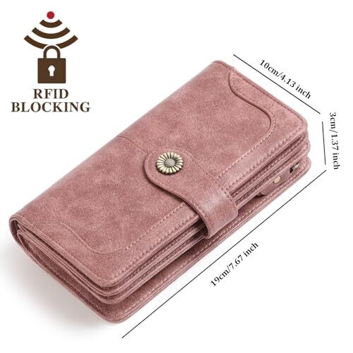 The wallet measures 7.48 x 3.94 x 1.18 inches (19 x 10 x 3 cm). It features oil wax leather with a fabric lining and meticulous stitching. Capacity includes 24 card slots, 2 photo windows, 4 full-length receipt pockets, a large zip pocket composed of three compartments (one for phones under 6.5 inches without a case, one inner zip pocket for coins and small items, and one additional section), and a removable wrist strap. It provides RFID-blocking protection for IDs, driver’s licenses, and credit cards. It is designed to be held or carried in a bag and comes in the Cd-Rouge-Pink color option.