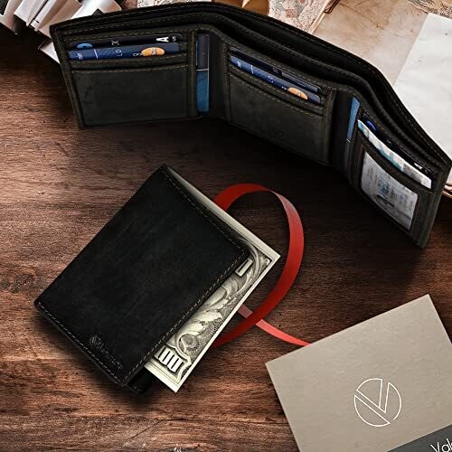 Black Hunter Genuine Leather RFID blocking slim trifold wallet protects cards with 13.56 MHz shielding, while delivering a compact silhouette with 7 card slots, 1 ID window, and two note compartments in a classic Black Hunter finish.