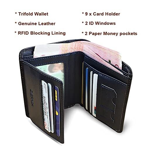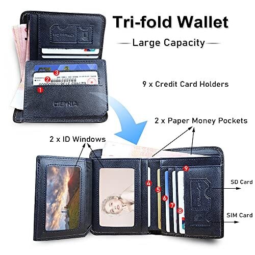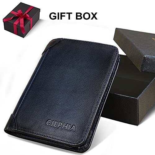 Ciephia's RFID-blocking trifold wallet combines classic genuine leather with a slim, multi-pocket design. It holds cards, IDs, cash, and photos without bulk, features 2 ID windows and a money clip, and arrives in gift-ready packaging.