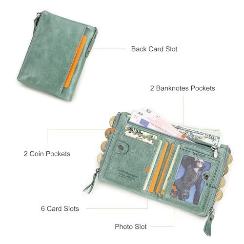 - Generous organization: multiple card slots, coin pocket, zip compartments, photo/ID window and banknote pocket to simplify shopping and travel.