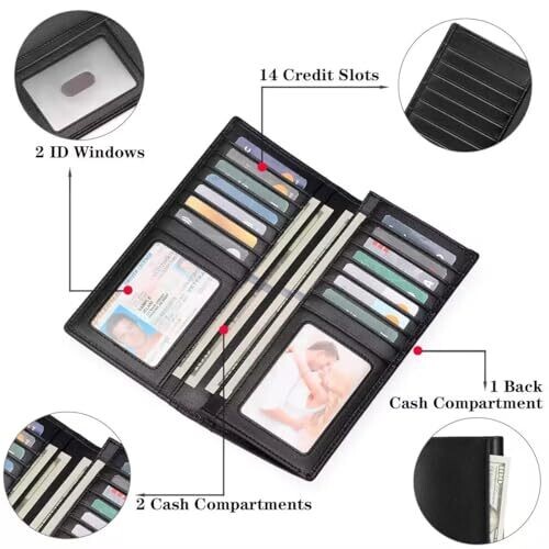 • Thoughtful details include multiple card slots, window IDs, and long compartments to keep cash and cards neatly organized.