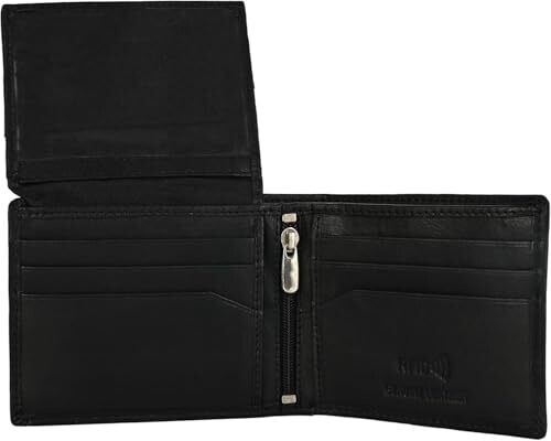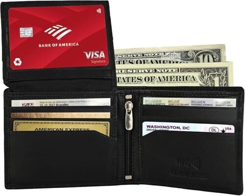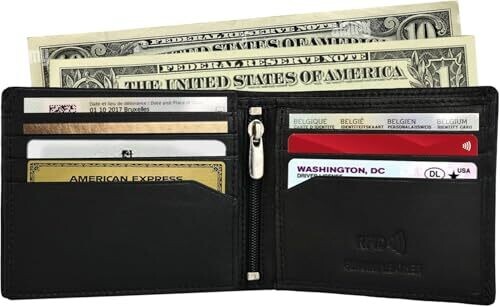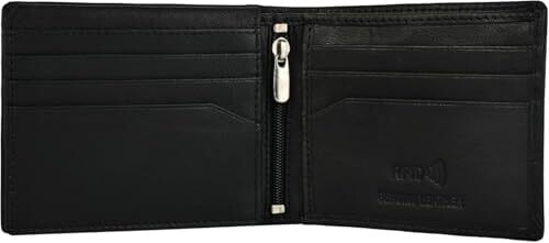 A genuine leather RFID-blocking wallet for men with a slim bifold design, zipper coin pocket, ID window, and multiple card slots. Durable, timeless style, compact enough for daily carry, business, or travel while protecting cards from RFID skimming.