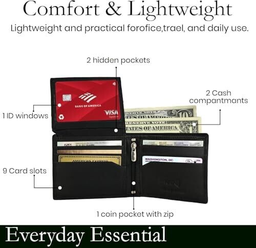 Slim bifold design with a zipper coin pocket; weighs light for everyday use.