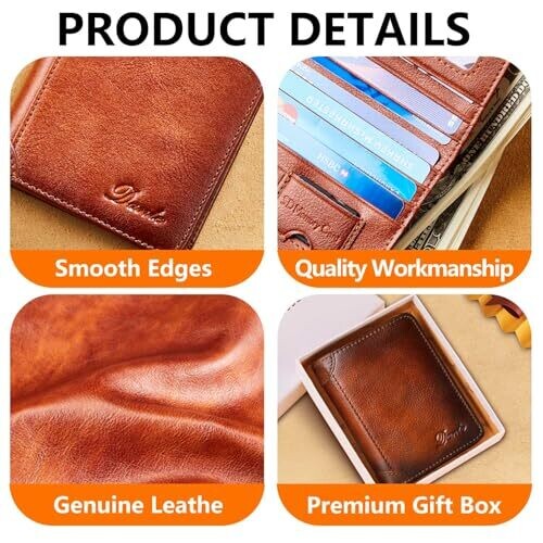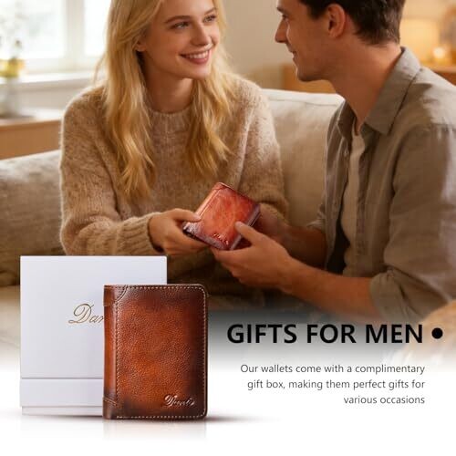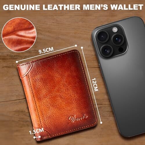 A men's genuine leather wallet featuring RFID blocking to protect cards, multiple card slots, an ID window, and a tri-fold design. Made from cowhide, slim for pockets, with a gift box included.