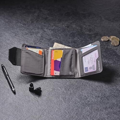 The wallet uses RFID-blocking fabric to reduce unauthorized access to card and ID information during travel.