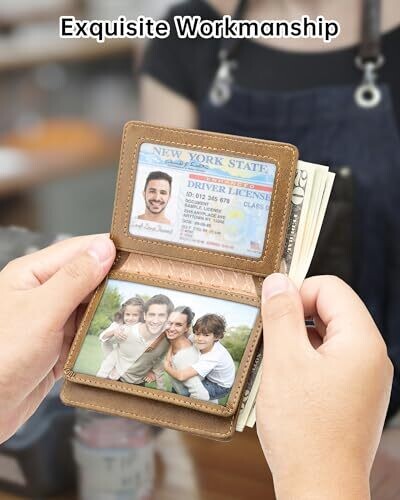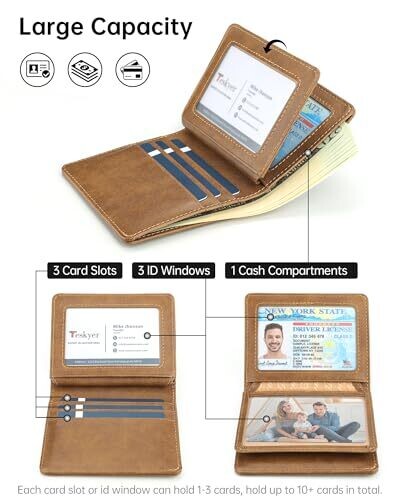 Includes 3 card slots, 3 ID / photo windows (each accommodating 2-3 cards), and a spacious cash compartment capable of holding over 10 cards and ample cash.