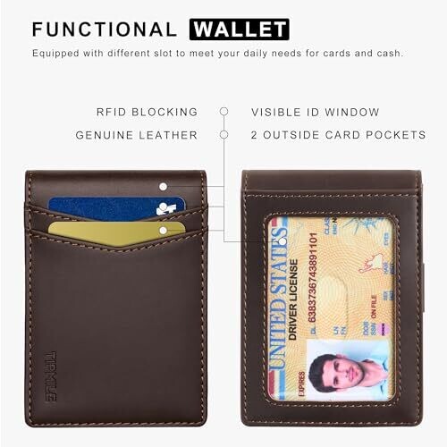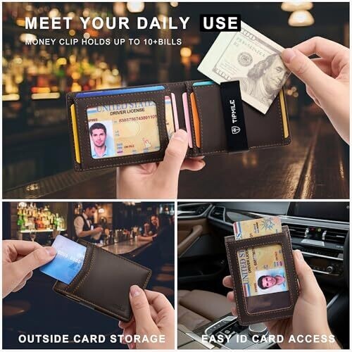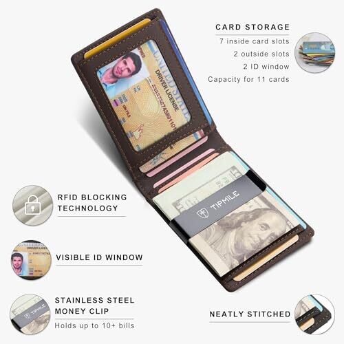 Tipmile presents a premium RFID-blocking slim bifold wallet with a durable money clip. Crafted from genuine leather, it ages beautifully, stays slim in your front pocket, and holds up to 11 cards and 15 bills for everyday convenience.