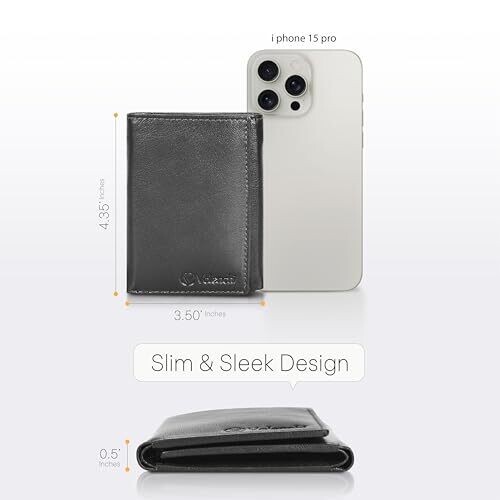 • Slim trifold design with a middle flap provides easy access and a sleek silhouette.