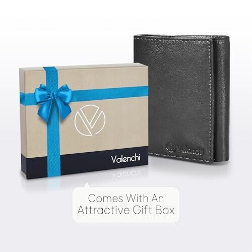VALENCHI Genuine Leather Mens RFID Blocking Slim Trifold Wallet with Middle Flap offers compact, organized storage for 9 cards, 2 ID windows, and 2 note compartments. RFID protection, 100% genuine BLACK NAPPA leather, masculine finish, and elegant gift-ready packaging.