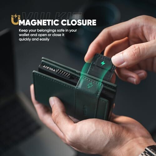 Experience everyday elegance with the VULKIT bifold wallet. Features a magnetic closure, quick pop-up card access, RFID/NFC blocking, and a sleek green finish. Thoughtfully boxed, it makes a refined gift for yourself or someone special.
