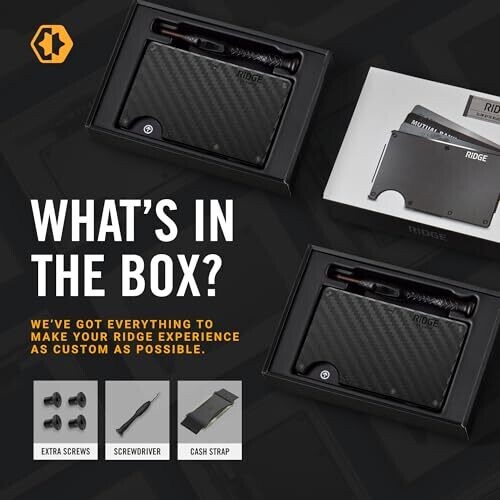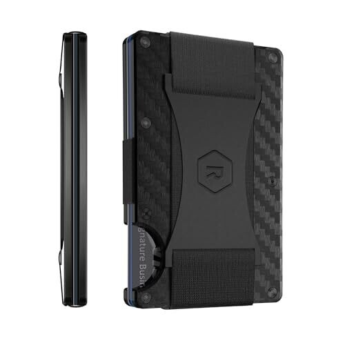 The Ridge Wallet for Men, Slim Wallet for Men - Thin as a Rail, Minimalist Aesthetics, Holds up to 12 Cards, RFID Safe, Aluminum Wallet with Cash Strap (Gunmetal) (Mountain Ridge, Carbon Fiber) description is marketing oriented and highlights design, usability, and user experience.