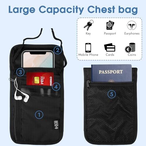 Compact, RFID-protected neck pouch designed for travel with five compartments for passport, cards, phone, coins, and cash. Lightweight, waterproof nylon, breathable back, and adjustable strap for Men, Women, and kids on-the-go adventures.
