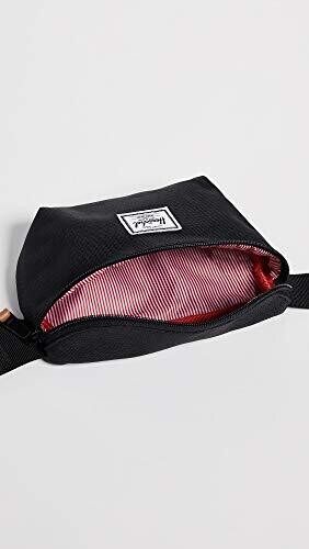 Herschel Unisex Adults Fashion Waist Pack, Black, 3.5L US. Signature striped fabric liner. Front storage pocket with waterproof zipper and key clip. Clip-fastened adjustable webbing strap. Waterproof zipper. Capacity