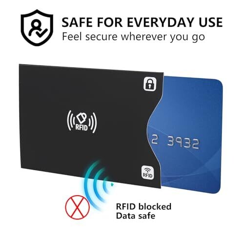 The product uses RFID/NFC blocking material designed to interfere with high-frequency proximity scanning at 13.56 MHz to prevent unauthorized access to card data.
