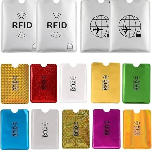 A complete RFID protection kit with 14 sleeves for cards, 10 card protectors, and 4 passport sleeves. Slim, durable, and easy to use, it shields cards and documents from unauthorized scans while traveling, shopping, or commuting without adding bulk.