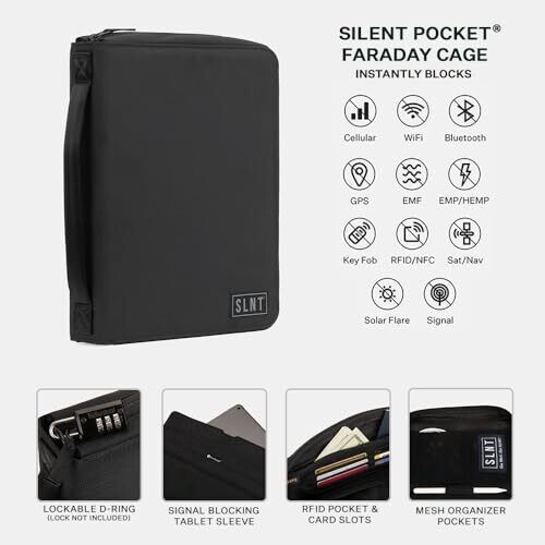 SLNT Essentials Tech Organizer with Faraday Tablet Sleeve provides secure, organized storage for tablets, cards, passport, and cables. Features RFID-blocking pockets, a lockable D-ring, water-resistant materials, and signal-shielding tech to guard against tampering and tracking.
