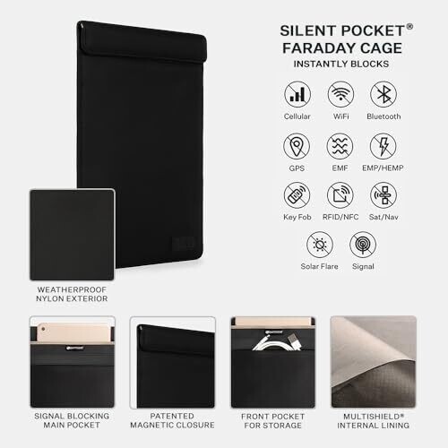 Protect privacy on the go with SLNT Faraday Bag Tablet Sleeve, a weatherproof, durable nylon sleeve with Silent Pocket tech. Blocks signals to prevent hacking and monitoring while fitting most tablets up to 10 inches for travel and daily use.