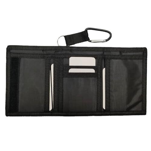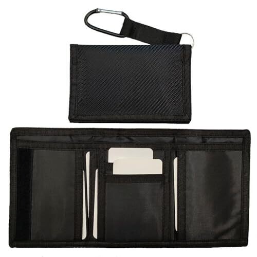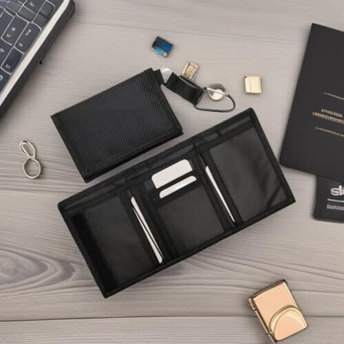 A slim, ultra-compact trifold wallet with RFID blocking protects cards on trips. Holds 6 cards, a large bill compartment, and a zippered coin pocket in a durable carbon fiber-inspired design, packaged in a gift box for dads, boyfriends, or travelers.